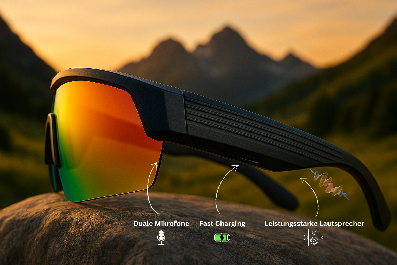 | UV400-Shield – verspiegelte PC-Linsen filtern 100 % UV-Strahlung & sind schlagfest. | Typ-C-Fast-Charge: voll in ~60 min |